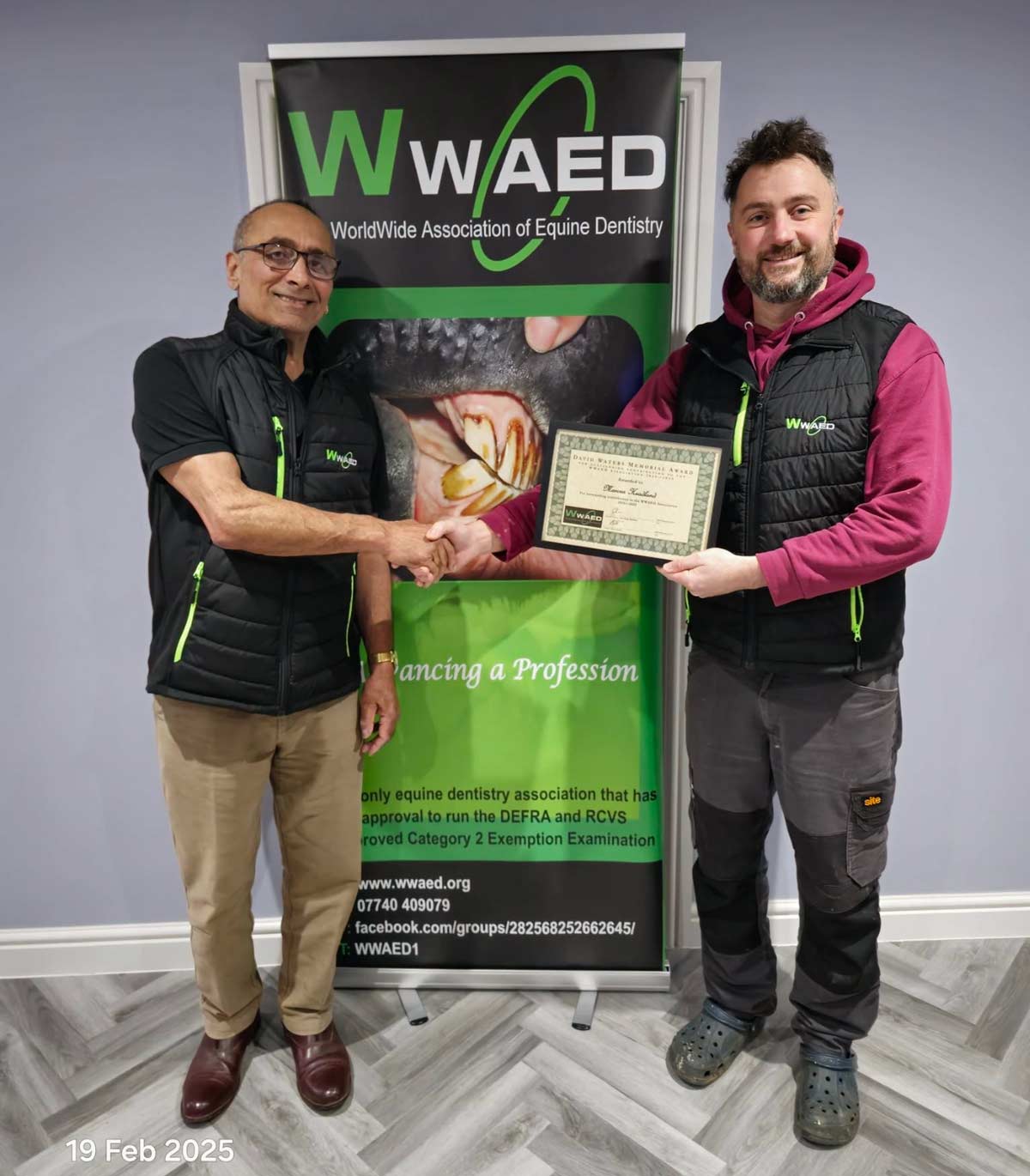 Marcus receiving the very first David Waters Memorial Award from WWAED for his commitment to equine dentistry. February 2025
